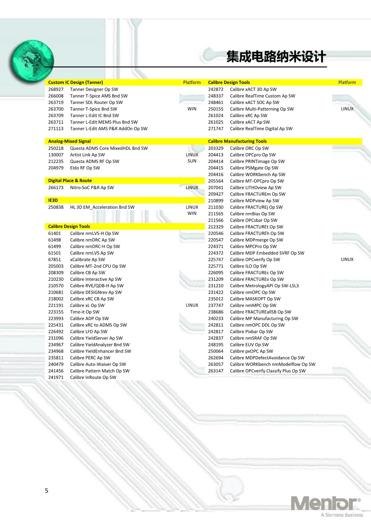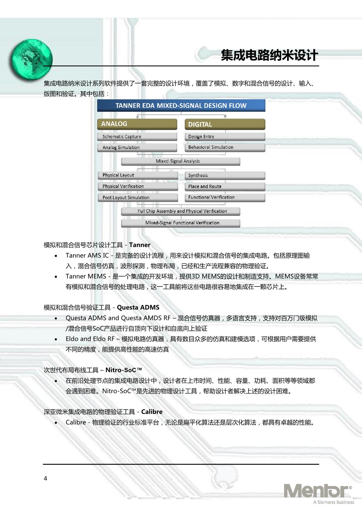 集成電路納米設(shè)計(jì)系列軟件提供了一套完整的設(shè)計(jì)環(huán)境,覆蓋了模擬、數(shù)字、混合信號(hào)的設(shè)計(jì)、輸入、版圖和驗(yàn)證。包括:模擬和混合信號(hào)芯片設(shè)計(jì)工具 - Tanner、模擬和混合信號(hào)驗(yàn)證工具 - Questa ADMS、次世代布局布線工具 – Nitro-SoC?。本系列軟件為ASIC和FPGA的HDL設(shè)計(jì)、驗(yàn)證、綜合及測(cè)試提供了完整的解決方案。