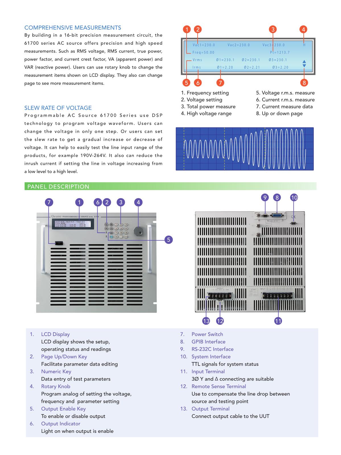 Chroma 61700 可編程交流電源內(nèi)部功率轉(zhuǎn)換應(yīng)用高頻切換式原理,并采用PWM控制方法,所以不但效率高,還可以輸出非常干凈,電壓失真度小于0.3%的正弦波。輸入端采用了功率因素改善線路(PFC) ,不僅提高電力使用率,還確保不污染輸入電源。內(nèi)部使用DSP的CPU做控制器,也用它做輸出電壓、電流、功率、功率因素、波峰因素等的量測。使用者可以在前面板用按鍵及旋鈕做各種設(shè)定,并在LCD熒幕上看到設(shè)定及量測結(jié)果。