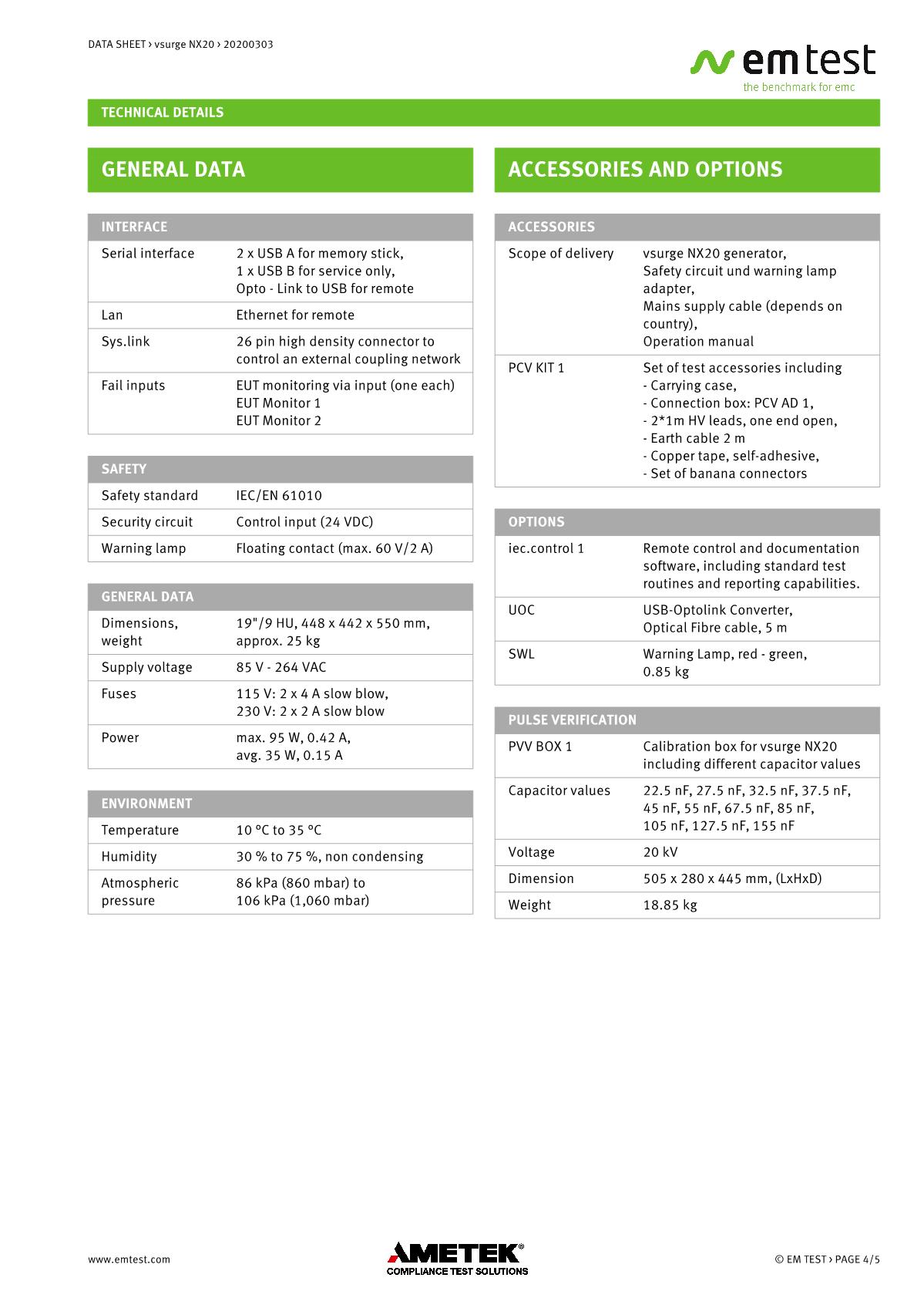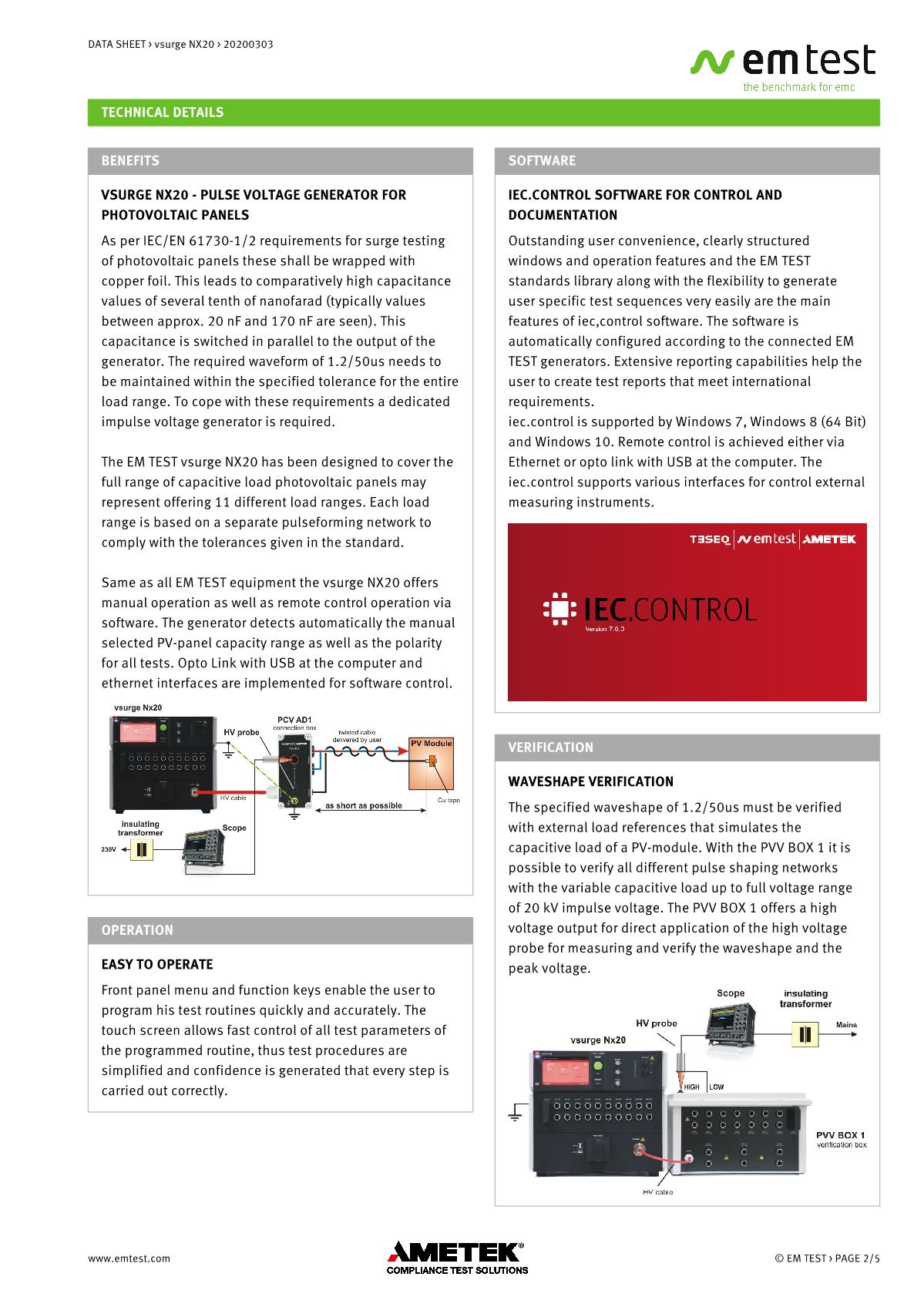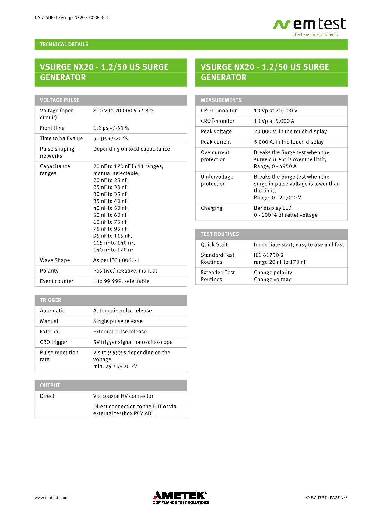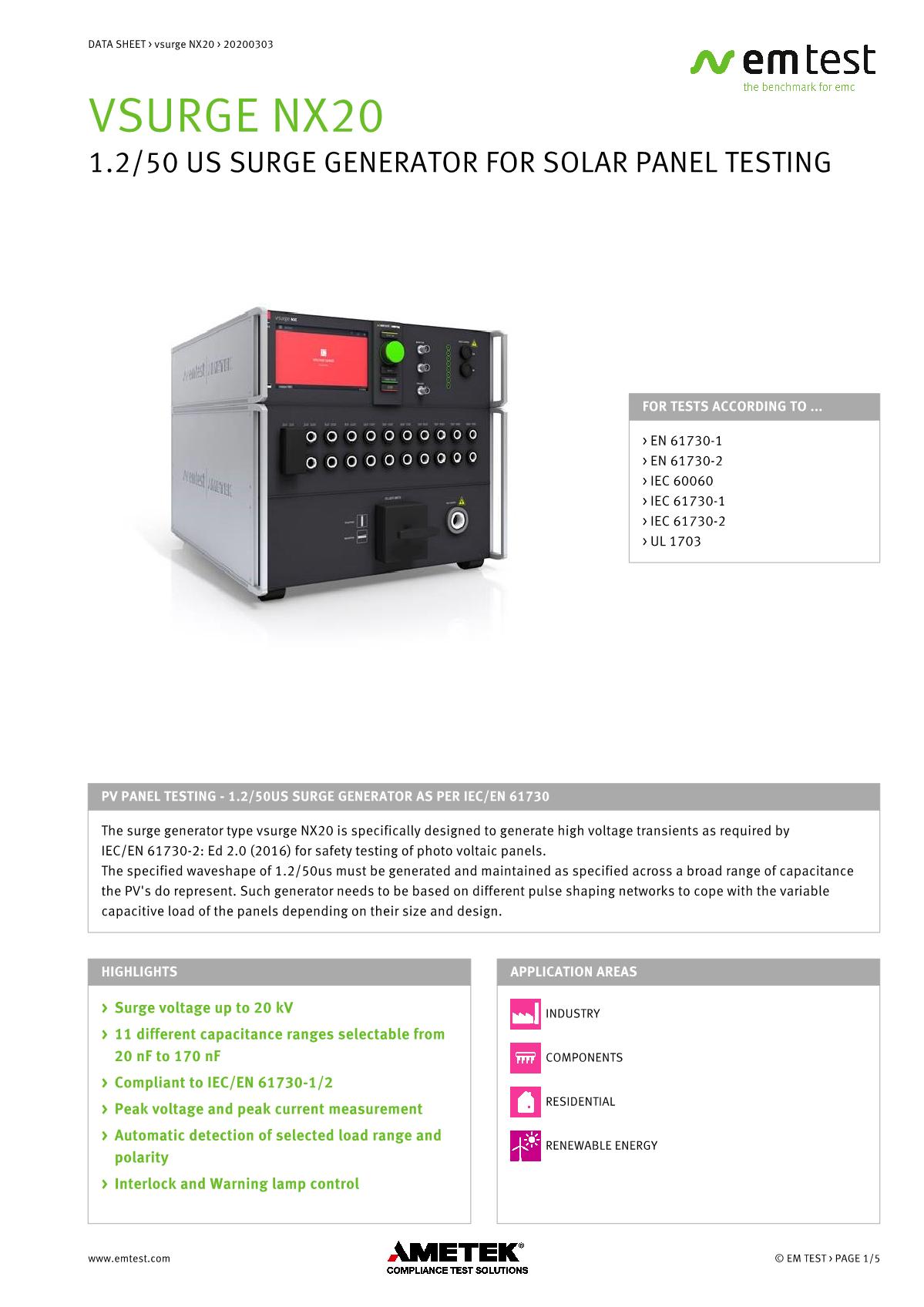 浪涌發(fā)生器vsurge NX20,品牌:EMTEST。高達20千伏的浪涌電壓,從20 nF到170 nF的11個不同電容范圍可選,符合IEC/EN 61730-1/2標準
