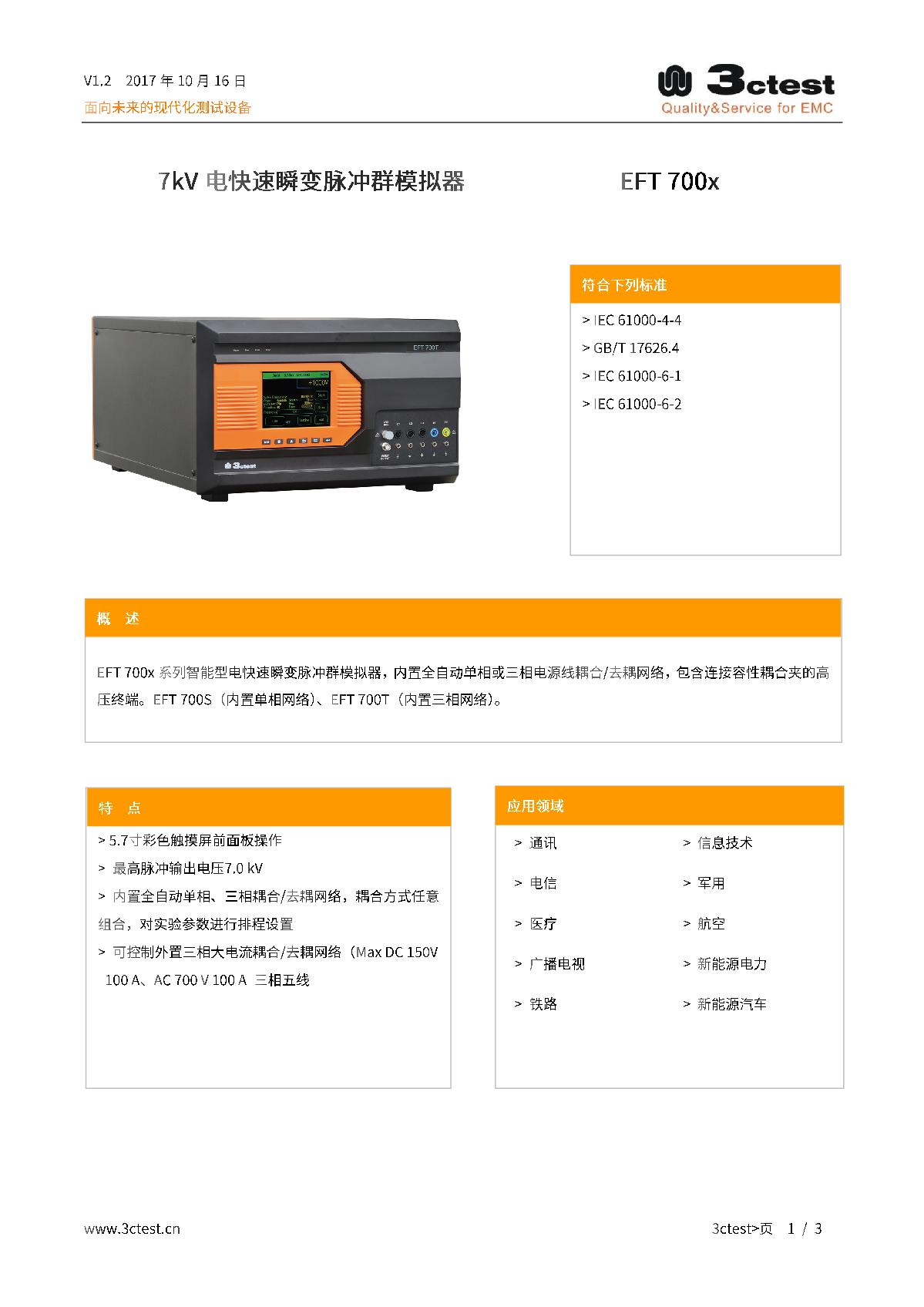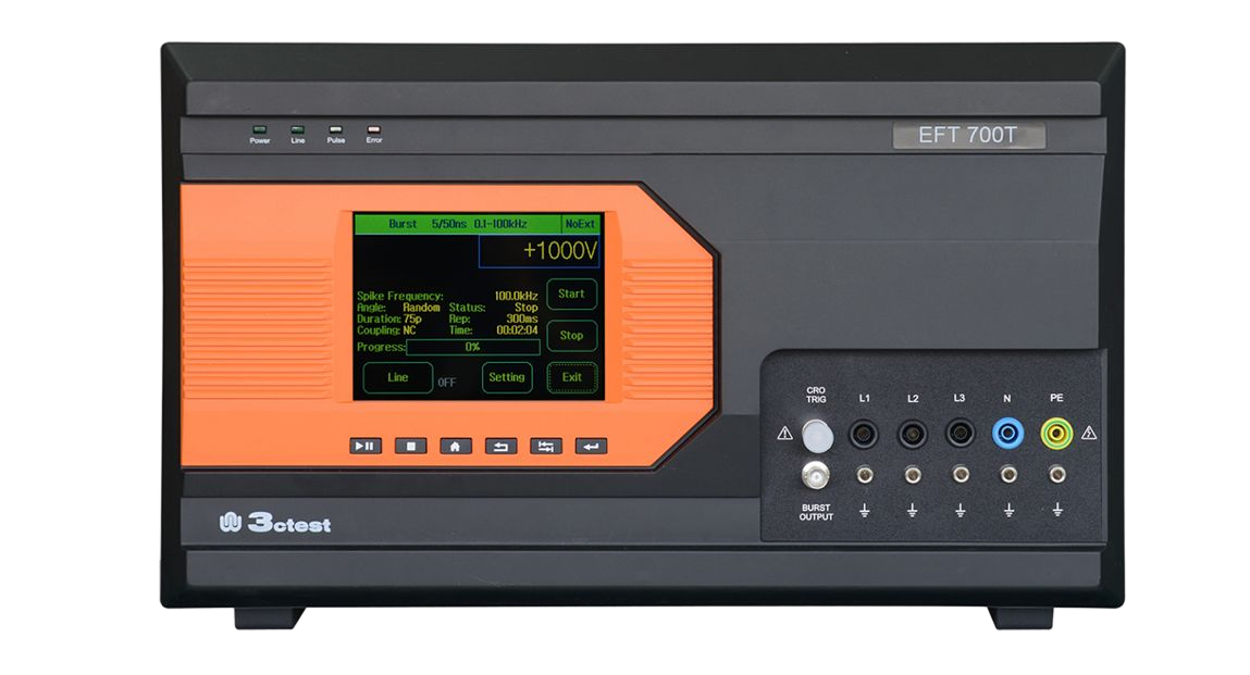 EFT 700x系列智能型電快速瞬變脈沖群發(fā)生器,品牌:3CTEST。內(nèi)置全自動單相或三相電源線耦合/去耦網(wǎng)絡(luò),包含連接容性耦合夾的高壓終端。EFT 700S(內(nèi)置單相網(wǎng)絡(luò))、EFT 700T(內(nèi)置三相網(wǎng)絡(luò))。EFT 700x系列智能型電快速瞬變脈沖群發(fā)生器滿足IEC 61000-4-4標準要求,具有可靠性好、性能穩(wěn)定、使用方便等特點