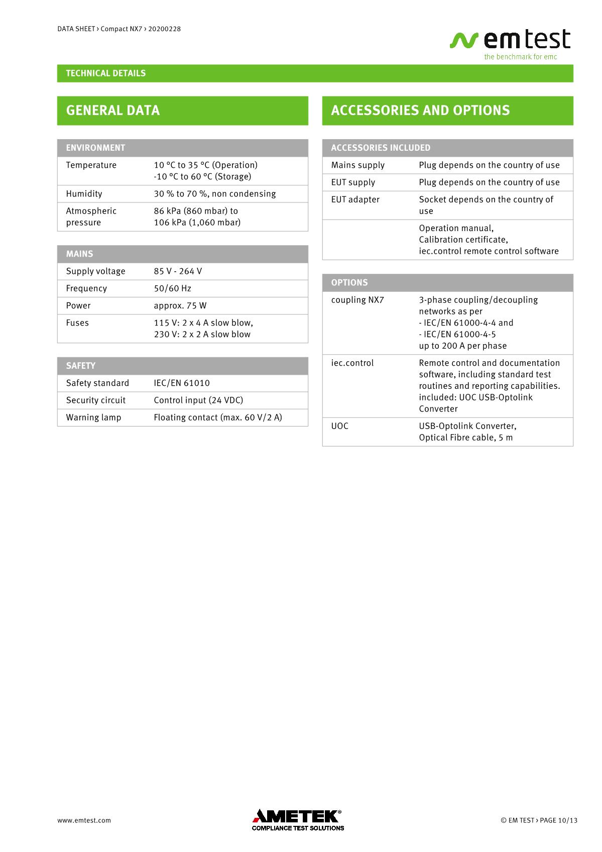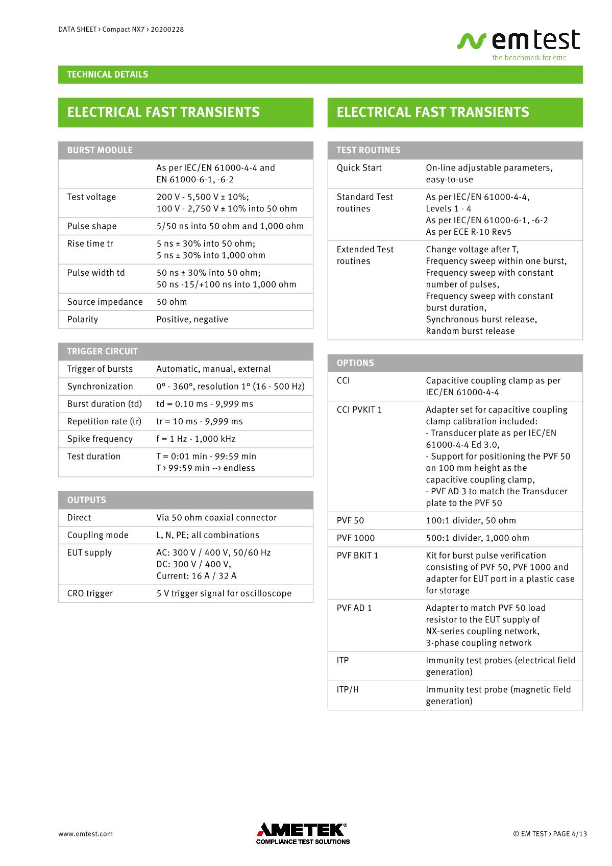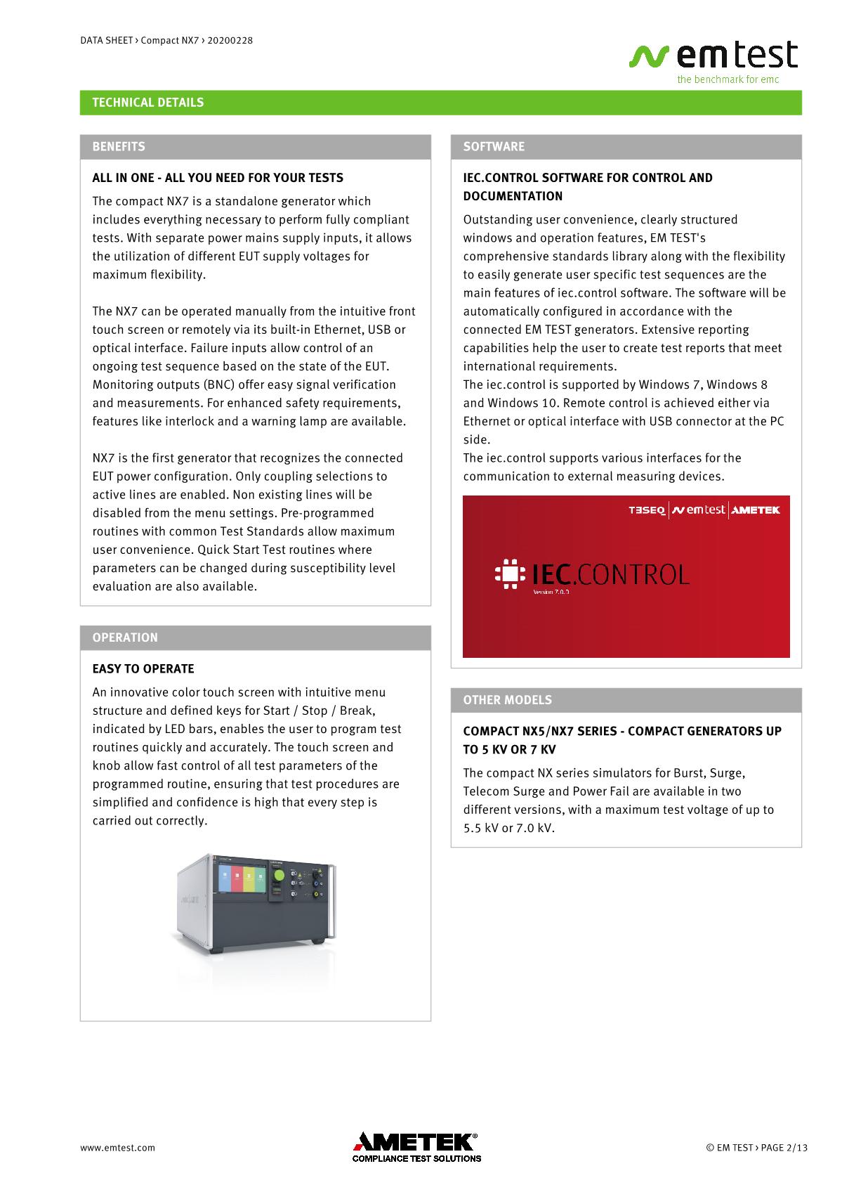 緊湊型下一代NX7是最通用的測試儀,品牌:EMTEST??蓾M足國際和商業(yè)標準的瞬態(tài)和電源故障要求。NX7采用易于使用的彩色觸摸屏,為預符合性抗擾度測試以及完全符合性測試和ce標志提供了經濟的解決方案。其內部單相耦合/去耦網絡(CDN)可通過每相高達200 A的自動控制外部CDN擴展至測試三相EUT。AMETEK CTS為磁場測試等各種應用提供大量附件。