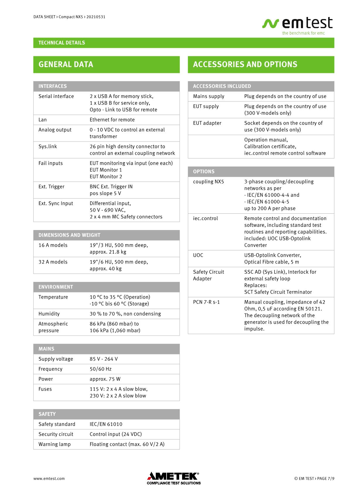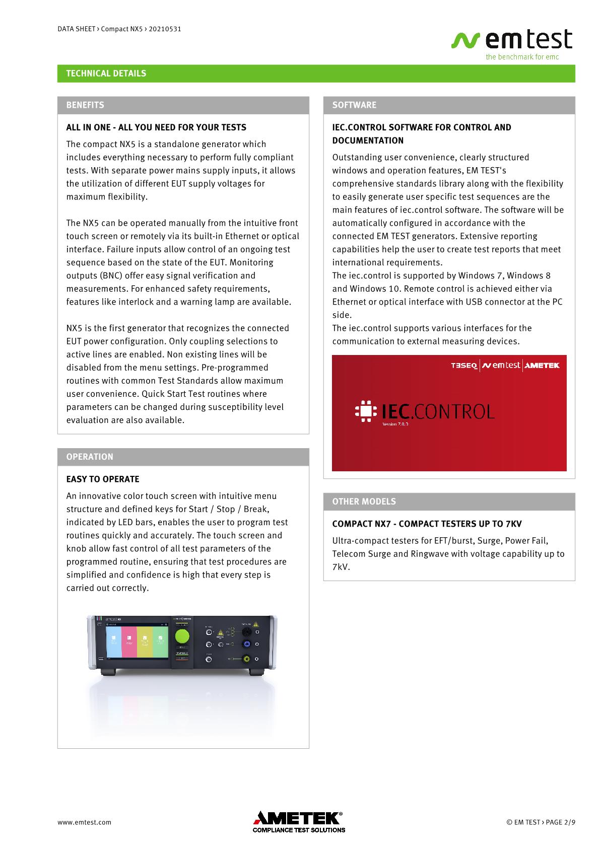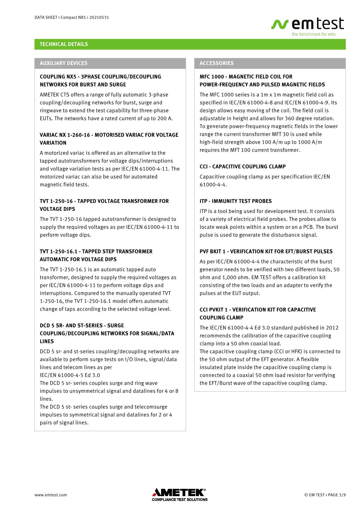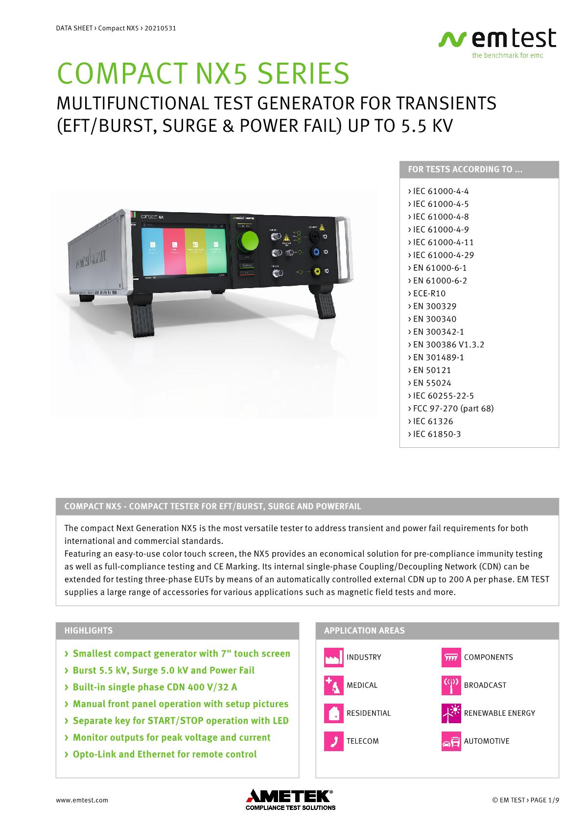 緊湊型NX5 ,品牌:EMTEST。用于EFT/Burst、浪涌和電源故障的緊湊型測試儀緊湊型新一代NX5是功能最全面的測試儀,可滿足國際和商業(yè)標(biāo)準(zhǔn)的瞬態(tài)和電源故障要求。NX5采用易于使用的彩色觸摸屏,為預(yù)符合性抗擾度測試以及完全符合性測試和ce標(biāo)志提供了經(jīng)濟的解決方案。其內(nèi)部單相耦合/去耦網(wǎng)絡(luò)(CDN)可通過每相高達200 A的自動控制外部CDN擴展至測試三相EUT。EM TEST為磁場測試等各種應(yīng)用提供大量附件。