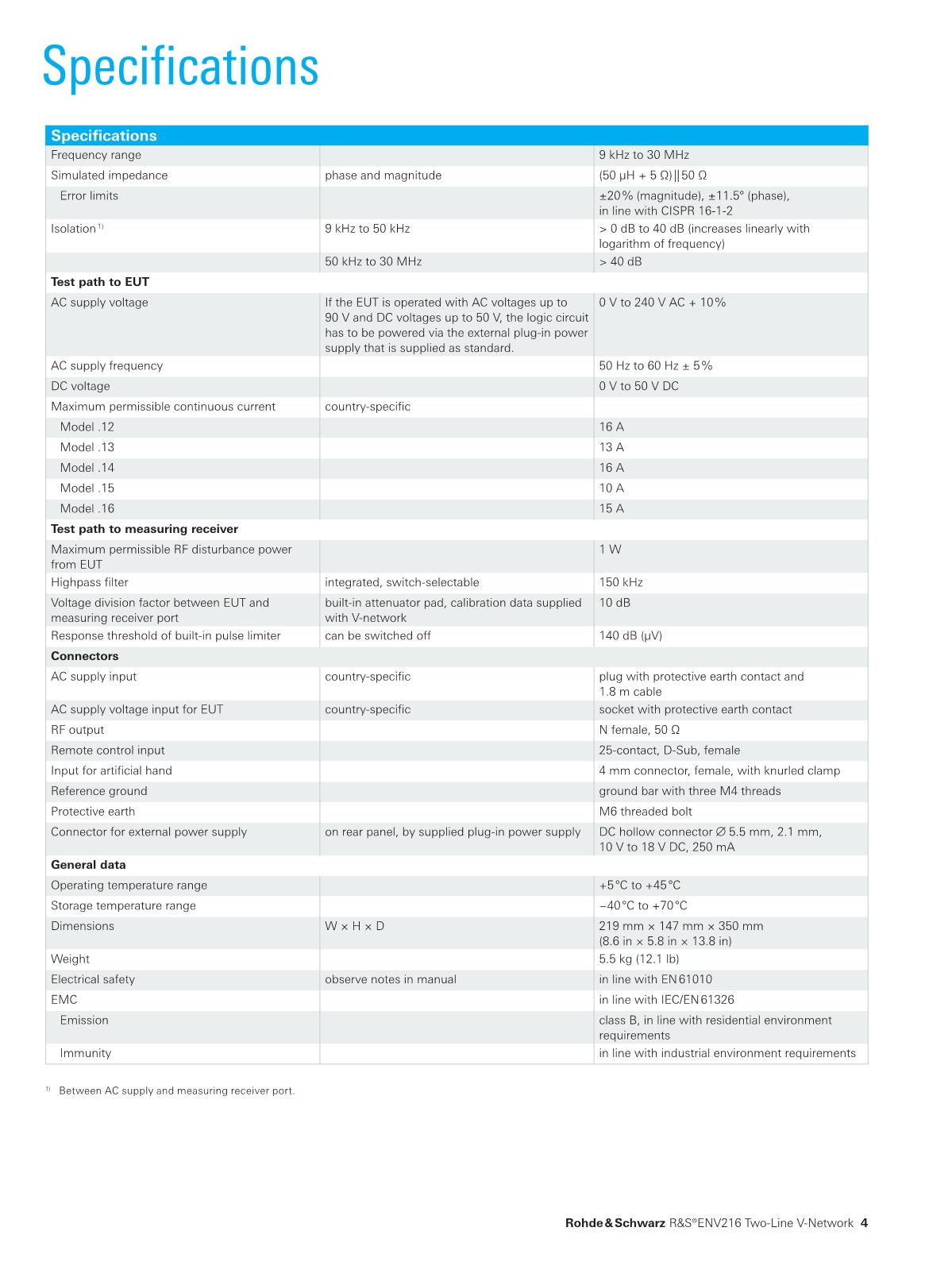 R&S?ENV216 二線制 V 形網(wǎng)絡(luò)滿足 CISPR 16-1-2 和 EN 55016-1-2 中有關(guān) V 形網(wǎng)絡(luò)的要求,在 9 kHz 至 30 MHz 的頻率范圍內(nèi),模擬阻抗為 (50 μH + 5 Ω) || 50 Ω;并滿足 ANSI C63.4 相關(guān)要求,頻率范圍為 150 kHz 至 30 MHz。具有接地保護觸點的插座可連接至被測設(shè)備。多款符合國家/地區(qū)特定連接器系統(tǒng)的型號可供選擇。得益于緊湊輕量化設(shè)計,R&S?ENV216 非常適用于變頻應(yīng)用,尤其是單相被測設(shè)備的現(xiàn)場