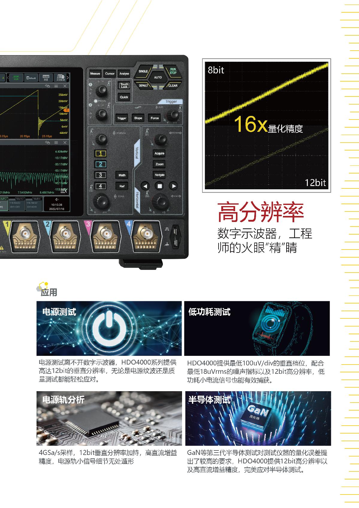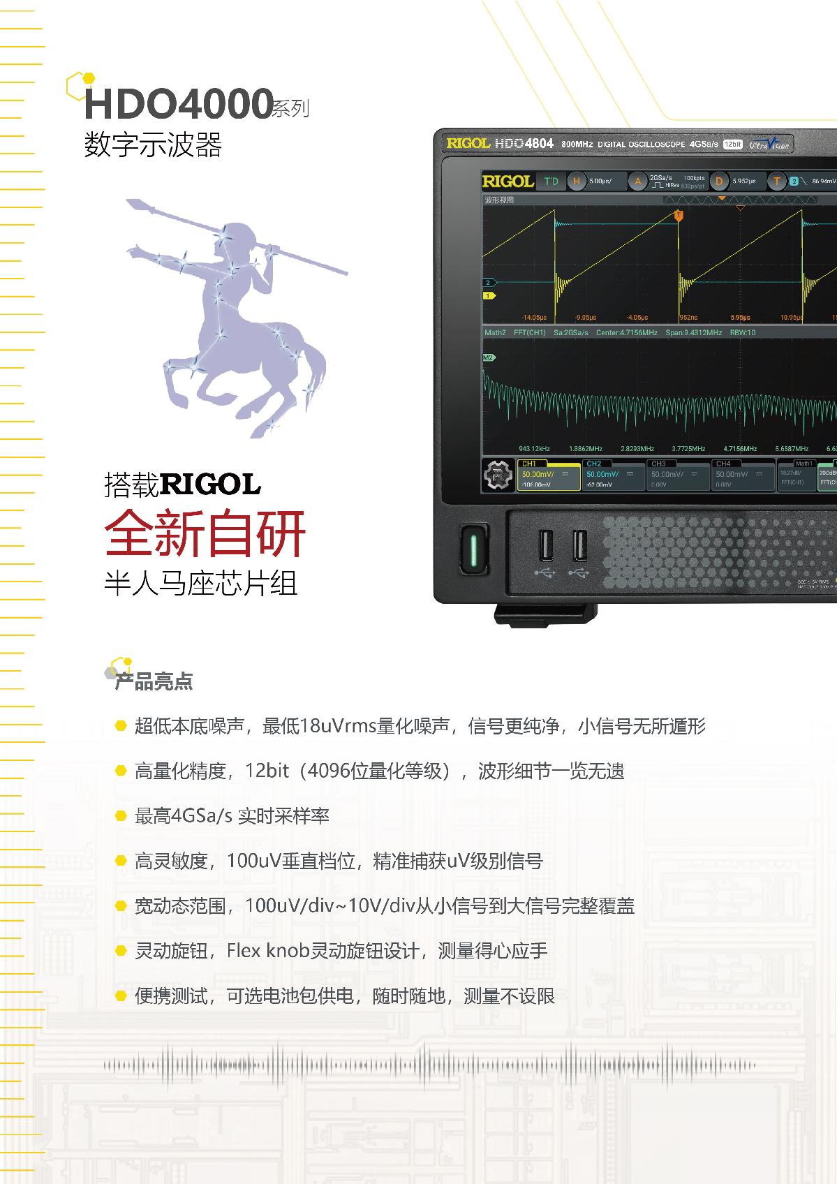 HDO4000 系列數(shù)字示波器是針對最廣泛的主流數(shù)字示波器市場的設(shè)計、調(diào)試、測試的需求而設(shè)計的數(shù)字示波器。搭載 RIGOL 全新自研半人馬座芯片組,實(shí)現(xiàn)了1,500,000 次/秒波形捕獲率(Ultra AcquireMode)、500 Mpts 存儲深度、12 bit 分辨率、優(yōu)秀的本底噪聲性能和垂直測量精度,能滿足更高精度的測量需求,為用戶帶來超凡的測試測量體驗(yàn)。
