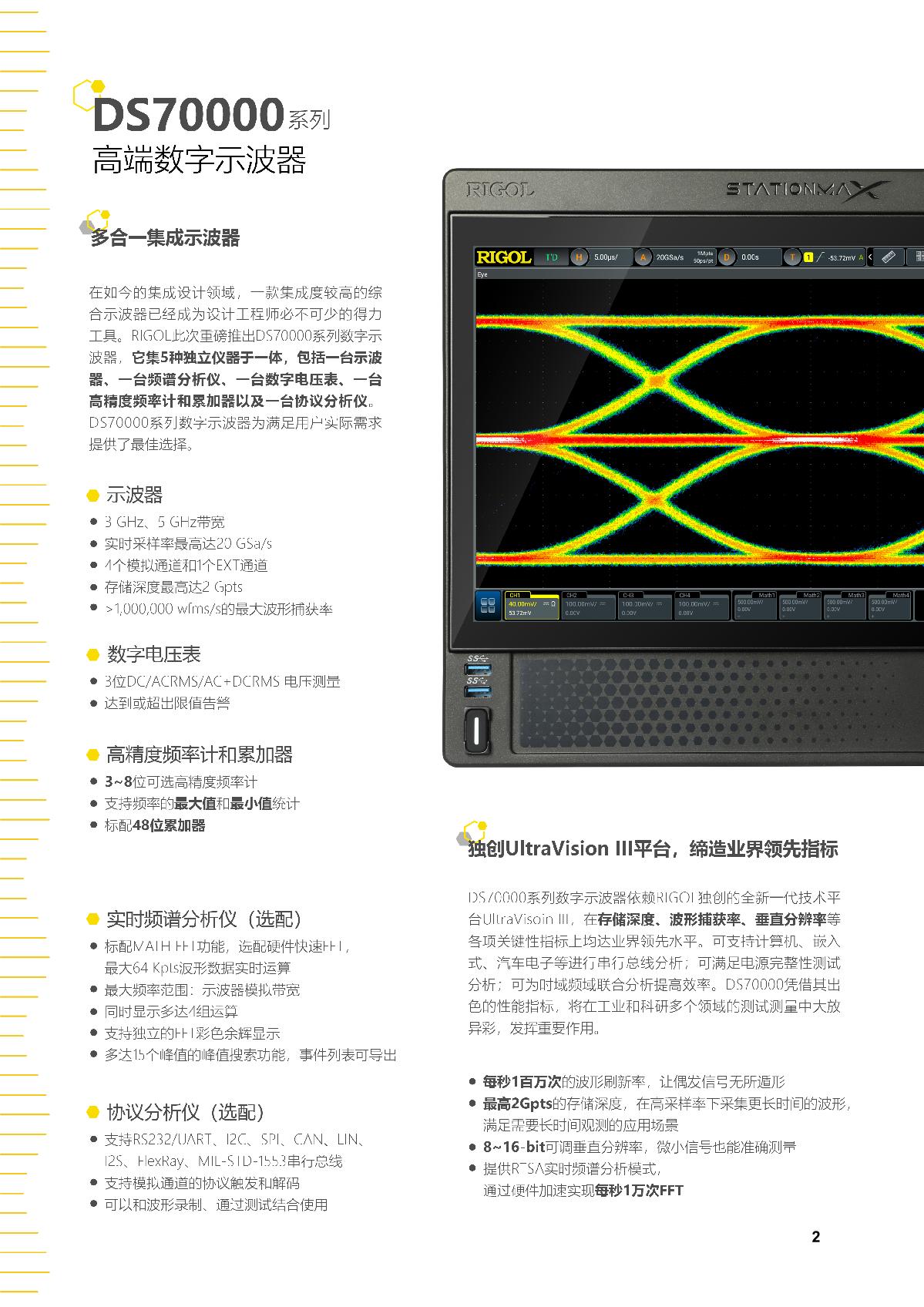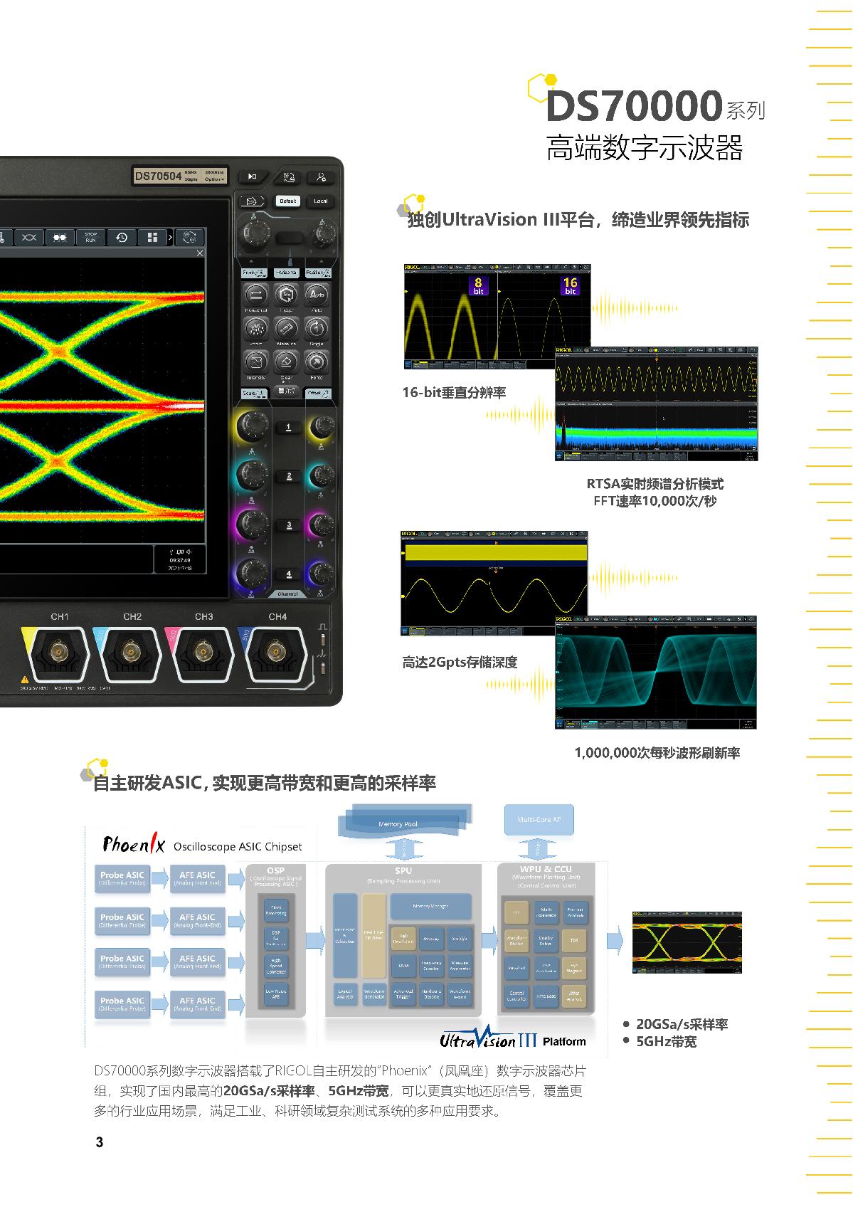 DS70000系列數(shù)字示波器是RIGOL自主研發(fā)的第七代數(shù)字示波器,充分發(fā)揮了RIGOL設(shè)計(jì)的“鳳凰座”示波器專用芯片組卓越性能,實(shí)現(xiàn)了國內(nèi)最高的20GSa/s采樣率、5GHz實(shí)時(shí)帶寬。除硬件指標(biāo)的提升,DS70000系列數(shù)字示波器還提供了多種人性化設(shè)計(jì),保證了高質(zhì)量的客戶體驗(yàn)。