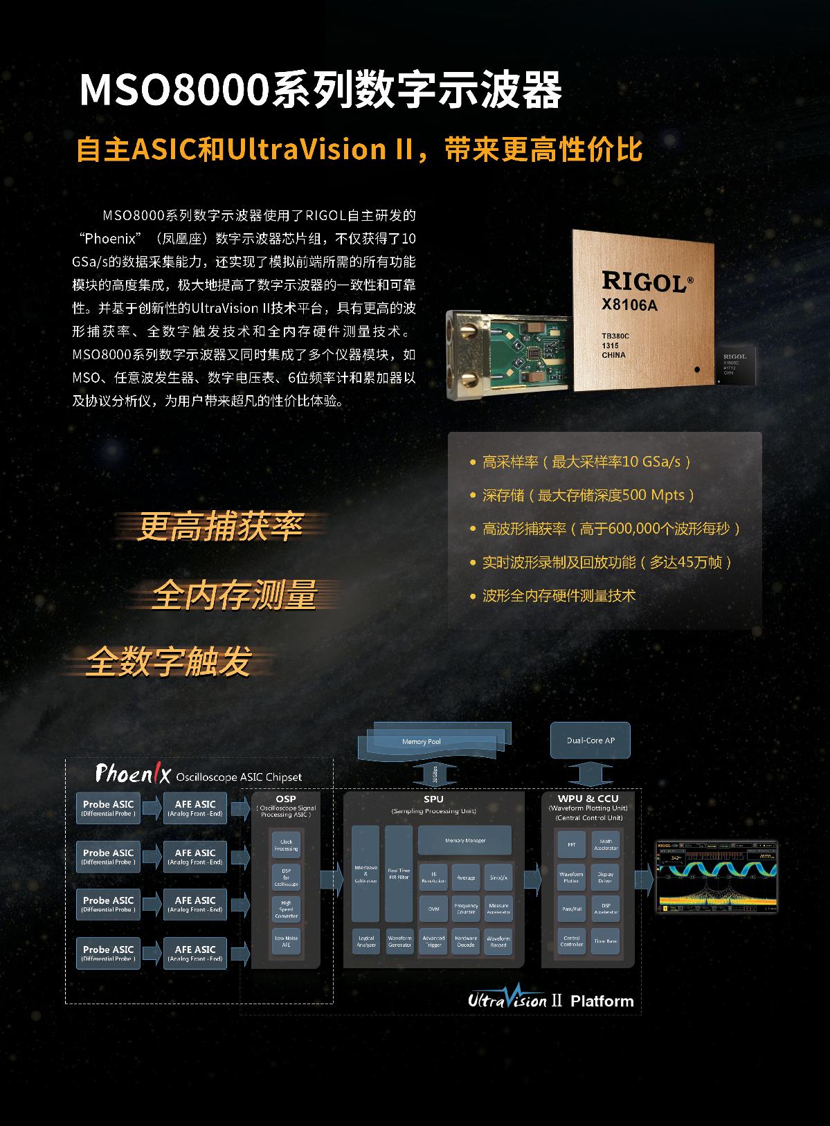 MSO8000系列數(shù)字示波器是基于RIGOL自主知識(shí)產(chǎn)權(quán)的ASIC芯片和UltraVisionII技術(shù)平臺(tái)的中高端混合信號(hào)數(shù)字示波器。示波器模擬通道帶寬高達(dá)2 GHz,集7種儀器于一身,具有500 Mpts超大存儲(chǔ)深度、良好的波形顯示效果、優(yōu)異的波形捕獲率和強(qiáng)大的數(shù)據(jù)分析功能,多項(xiàng)指標(biāo)均達(dá)業(yè)界一流水平,并且支持實(shí)時(shí)眼圖測(cè)量和抖動(dòng)分析,是業(yè)內(nèi)最具性價(jià)比優(yōu)勢(shì)的2 GHz混合信號(hào)數(shù)字示波器。
