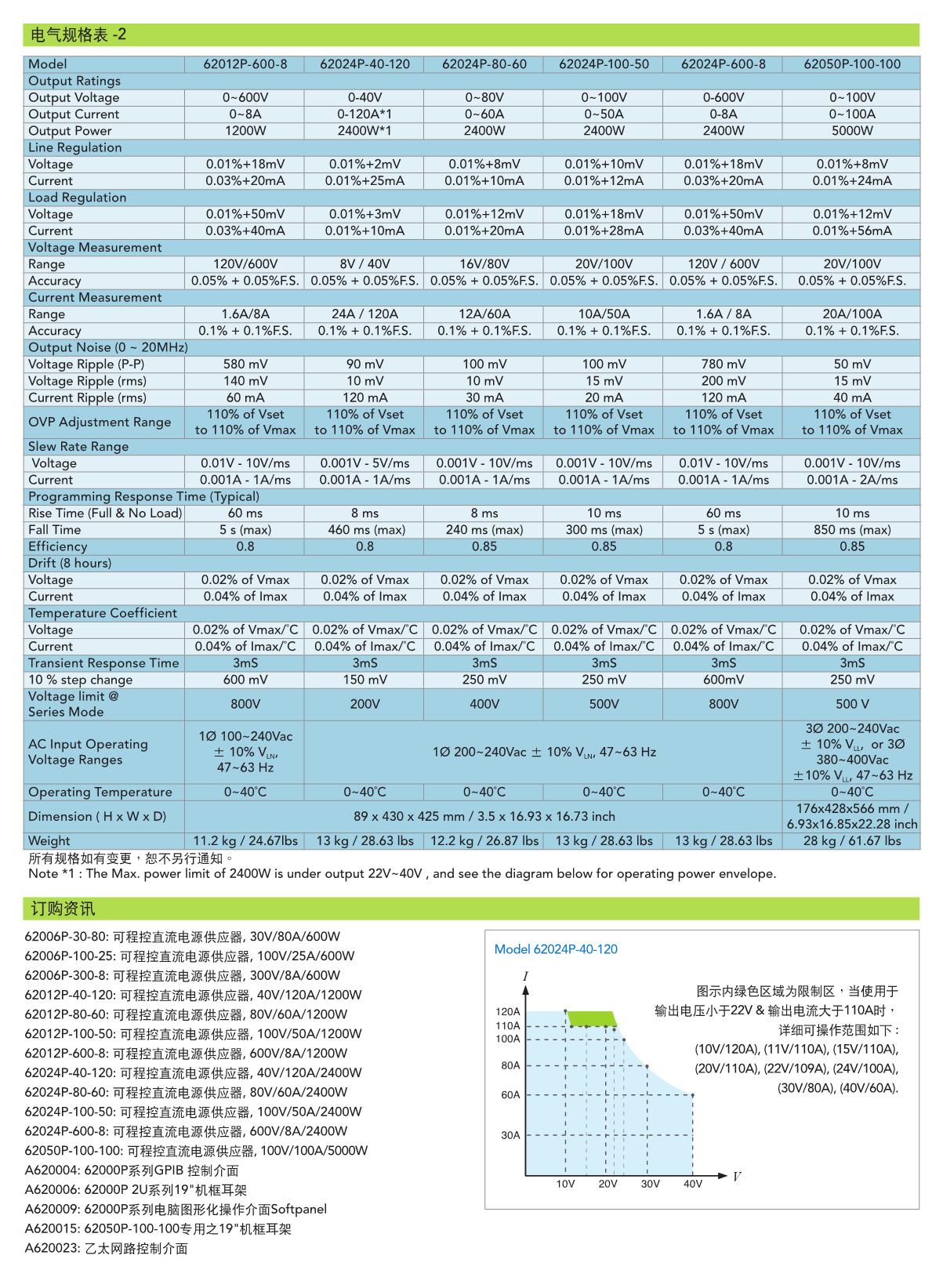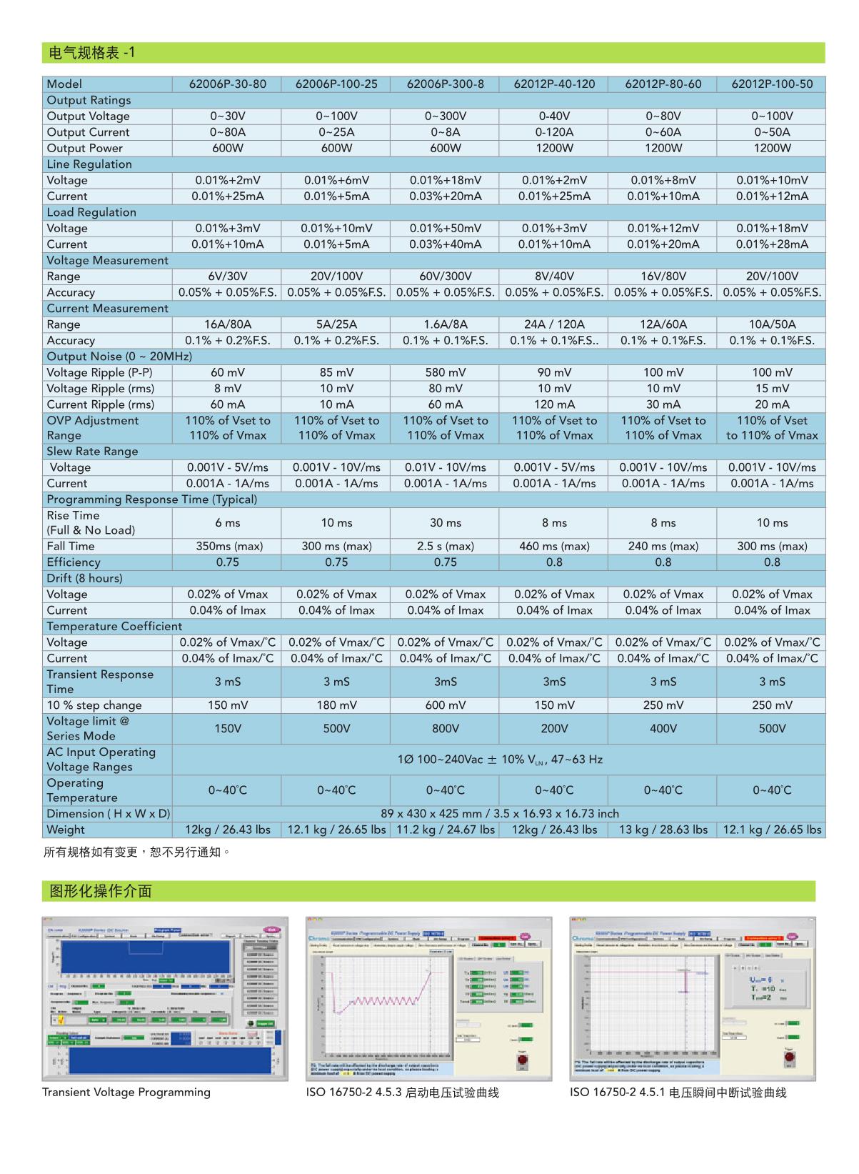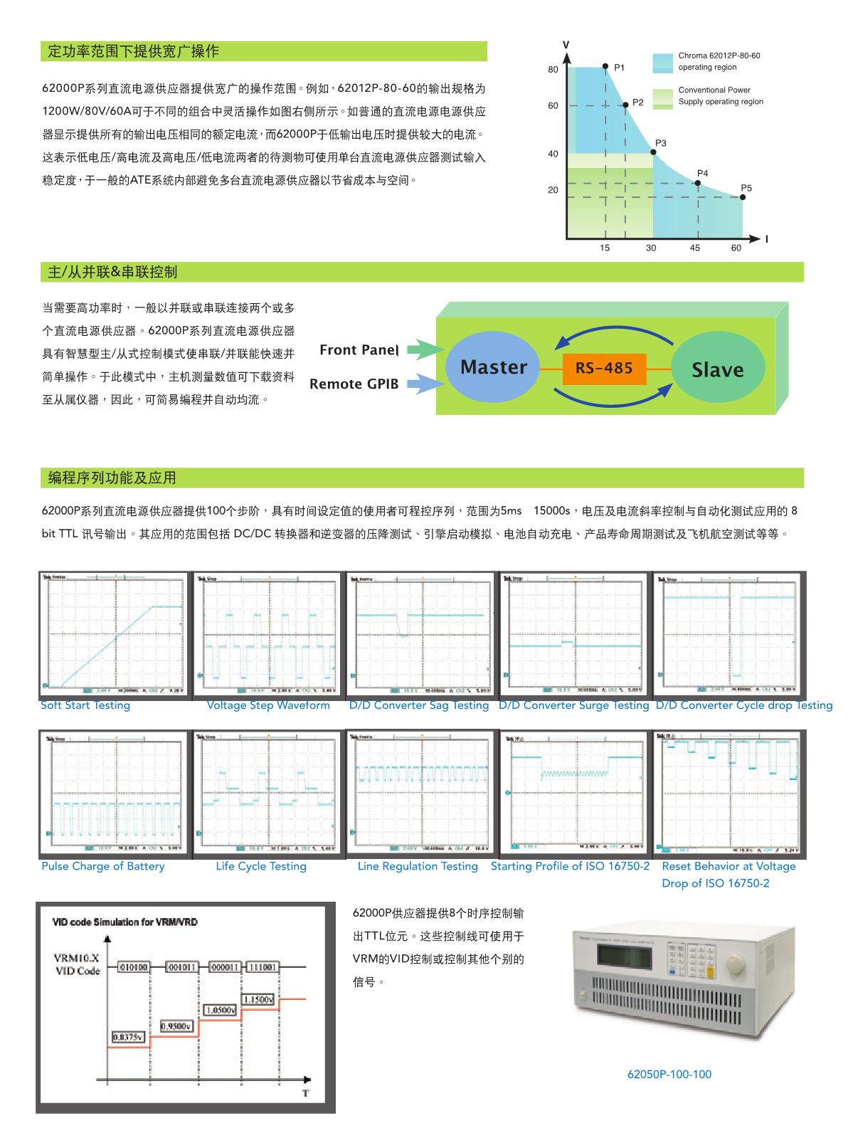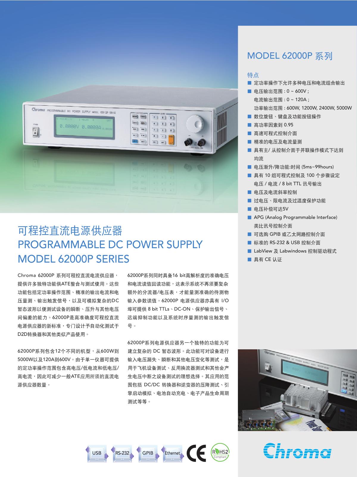 62000P系列包含12個(gè)不同的機(jī)型, 從600W到5000W以及120A到600V。 由於單一儀器可提供的定功率操作範(fàn)圍包含高電壓/低電流和低電壓/高電流, 因此可減少一般ATE應(yīng)用所須的直流電源供應(yīng)器數(shù)量。